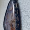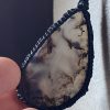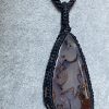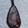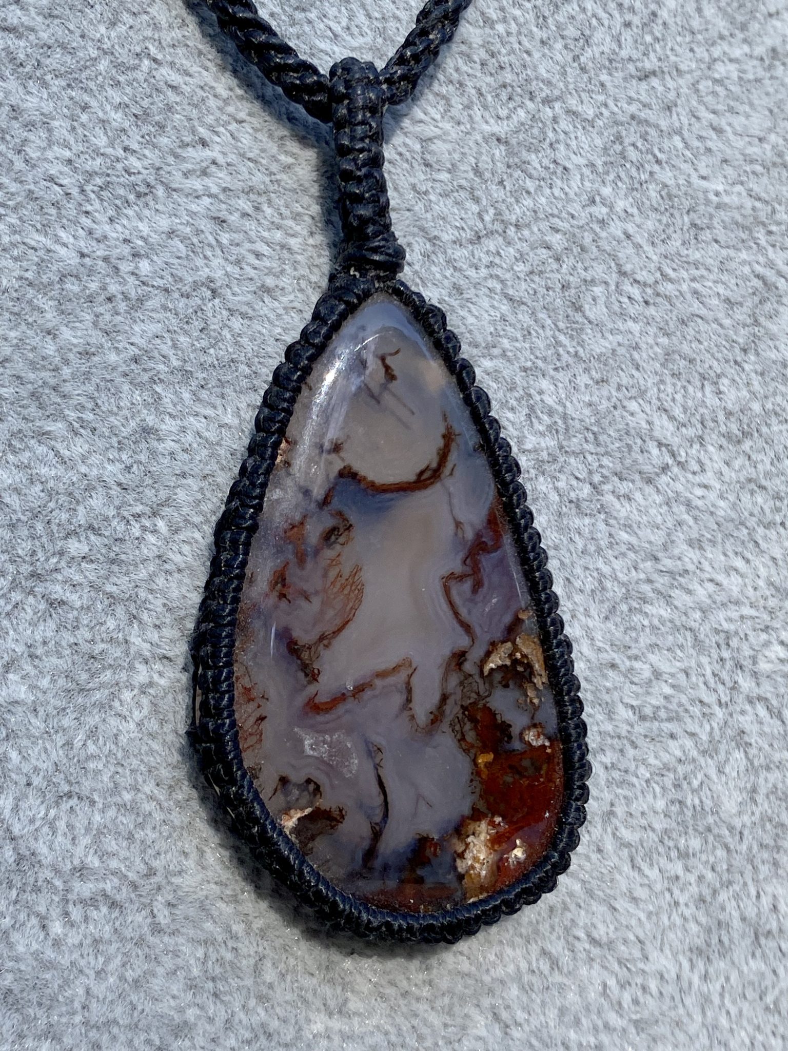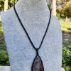 Beautiful Montana Agate cabochon (2″ long x 1 – 1.25″ wide) wrapped in black silk cord, with a knotted silk “chain” necklace that measures 18″ long, ending with a stainless steel clasp.