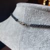 Hi there. My name is Amanda. I have been making jewelry and selling it around the world for over 2 decades. The silk cord I use to wrap stones and make the “chain” is not easy to find. Once the necklace is finished, I melt the bit of wax with a low heat blow dryer or with the sunshine as the weather allows. With the wax melted, a soft, water resistant material that is also very durable is what you get. This jewelry can easily last years, even with daily use, and of course…
